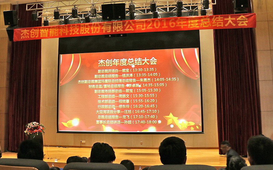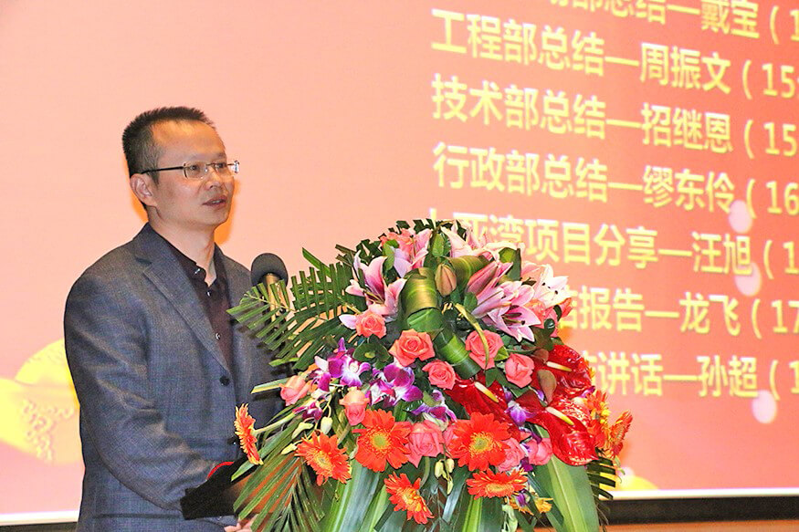 总结大会上,在公司副总裁戴宝先生激情洋溢的开场白后,副总裁钱洪涛先生、金沙3354cc智能董事兼蓝玛星际总经理朱勇杰先生、财务总监兼董秘李卓屏女士、副总裁戴宝先生、工程部总监周振文先生、技术部总监招继恩先生、行政部总监缪东伶女士、工程部副总监汪旭先生、总裁龙飞先生先后登台,分别做了2016年度工作总结。